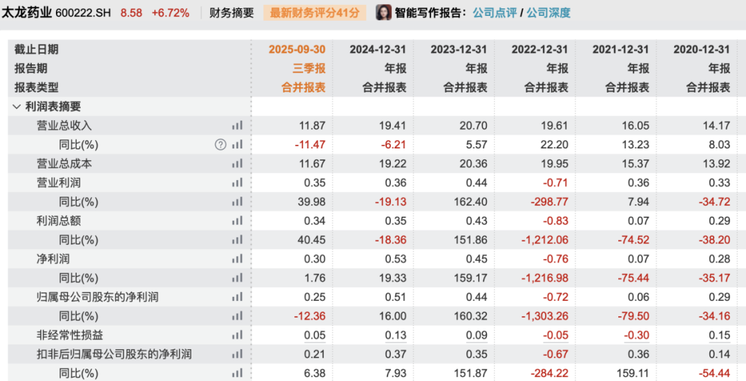 业绩方面,今年前三季度,太龙药业实现营业收入11.87亿元,较上年同期下降11.47%;归属于母公司股东的净利润为2532.55万元,同比下降12.36%。