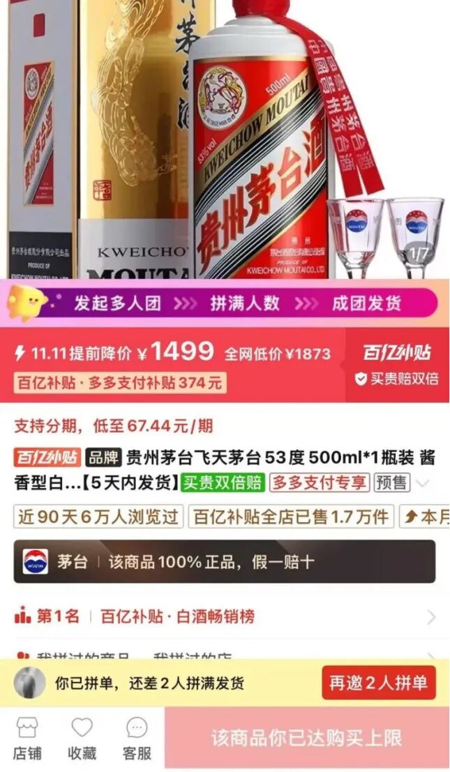 拼多多“双十一”活动的补贴价格,飞天茅台到手价1494元。