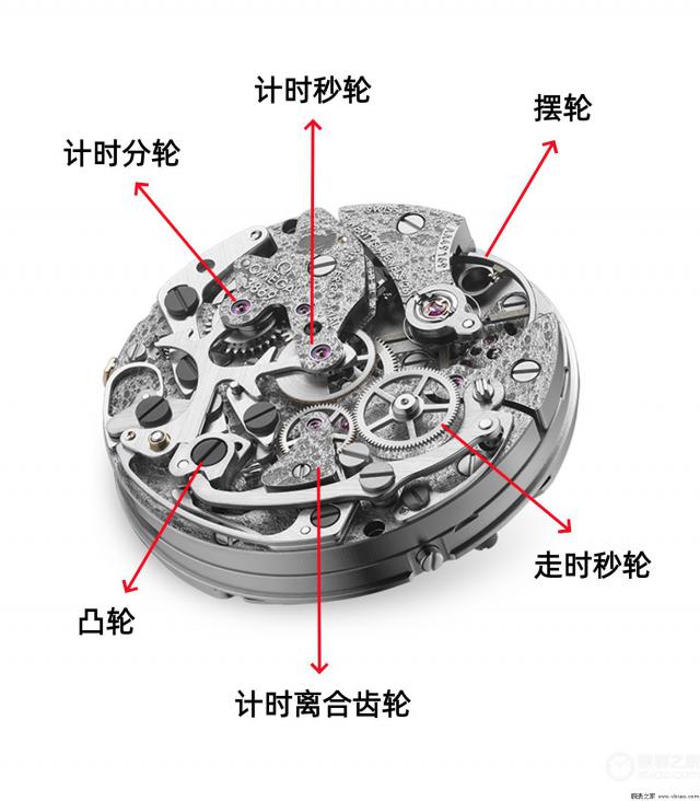 机芯的所有计时部件从右往左,沿着机芯中线依次排列,其中4个最显眼的齿轮,即走时秒轮、离合齿轮、计时秒轮和计时分轮都清晰可见,具有很高的观赏性和把玩性,同时控制计时功能的凸轮也能清楚看到。