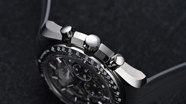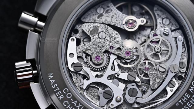 将腕表翻转到背面,可以看到经过雕刻处理后的欧米茄3861手动计时机芯,它被重新编号为3869。作为欧米茄具有标志性的手动计时机芯,它也是名表中为数不多采用“古典水平离合”设计的手动计时机芯之一。