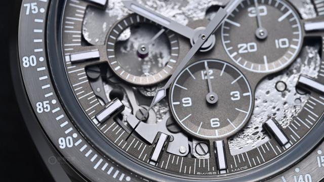 欧米茄对超霸“皓月之灰”3869腕表的表盘和机芯进行了大面积的激光雕刻处理,雕刻出月球表面以及月球坑的图案。再搭配上灰色的底色,完全还原了月球背面的真实景象,细节处理精细又逼真。