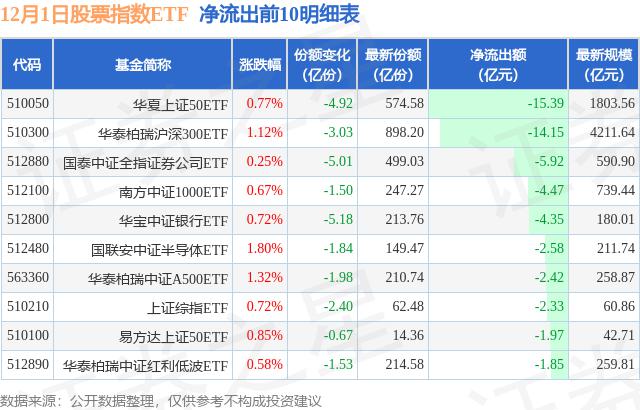 另一方面,当日有243只股票指数ETF基金出现资金净流出,华夏上证50ETF(510050)净流出金额居首,份额减少了4.92亿份,净流出额为15.39亿元。