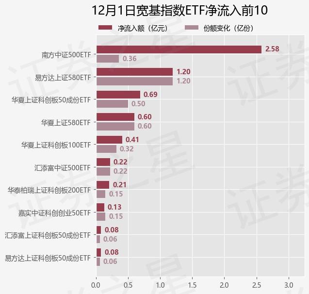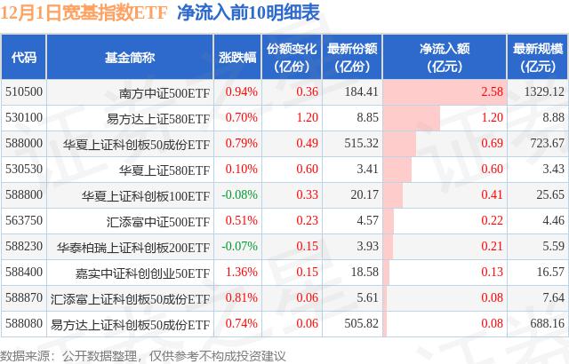 在当日交易中,有20只宽基指数ETF基金实现了资金净流入。其中,南方中证500ETF(510500)的资金净流入额位居首位,其份额增加了3600.0万份,对应的净流入金额为2.58亿元。