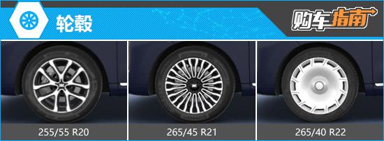 轮毂配置上,两款车型均标配20英寸星刃十辐运动轮毂(轮胎规格255/55 R20),支持选装21英寸星耀超多辐豪华轮毂(265/45 R21)或22英寸星冕镜面超奢轮毂(265/40 R22)。