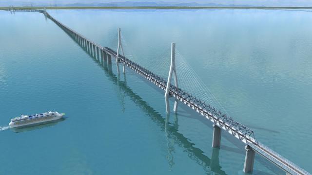 杭州湾跨海铁路桥全长29.2公里,采用时速350公里双线无砟轨道设计,包含北、中、南三座航道桥及跨大堤、海中、浅滩区引桥。建成后将创下多项世界纪录,对世界高速铁路桥梁建设具有里程碑意义。