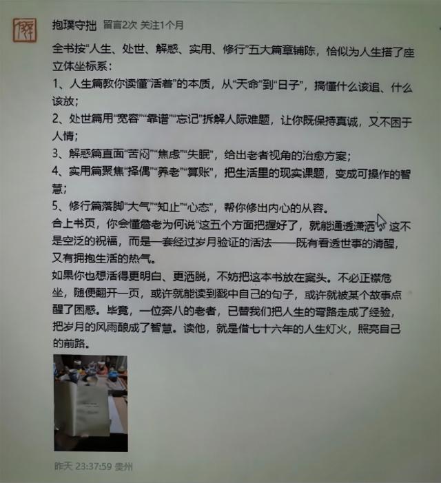 因为这位“抱朴守拙”的读者,真正读懂了《且将人生看通透》。