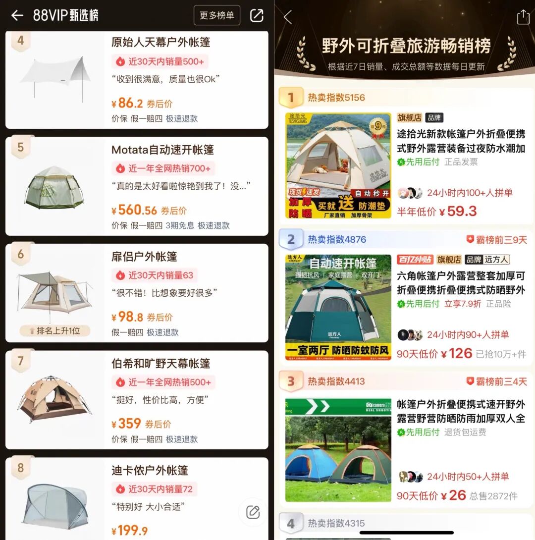左图为天猫平台,右图为拼多多平台,迪卡侬最便宜的帐篷售价199元,已无价格优势