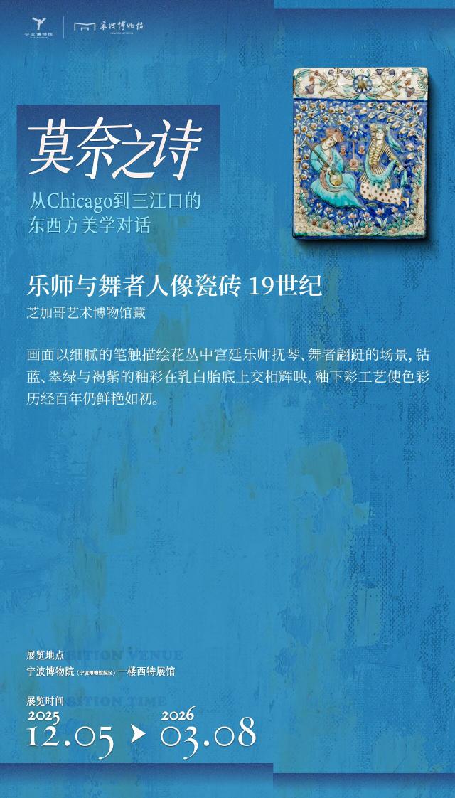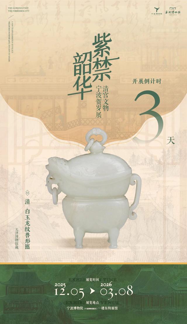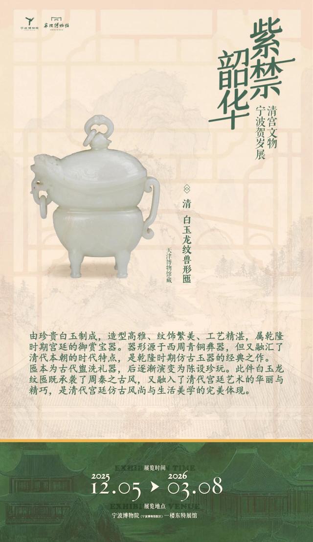 跨年双展即将启幕,两大重磅展览同步亮相:其一为“紫禁韶华——清宫文物宁波贺岁”展,展出清代白玉龙纹兽型匜等珍贵文物;其二是“莫奈之诗:从芝加哥到三江口的东西方美学对话”展,呈现乐师与舞者人像瓷砖等艺术精品。