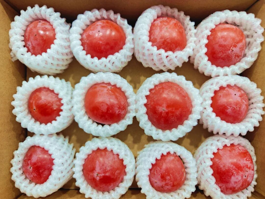 临潼火晶柿子果形圆润饱满,薄薄的果皮包裹着透亮的果肉,入口柔滑、汁水丰富,是不少人的心头好。