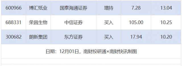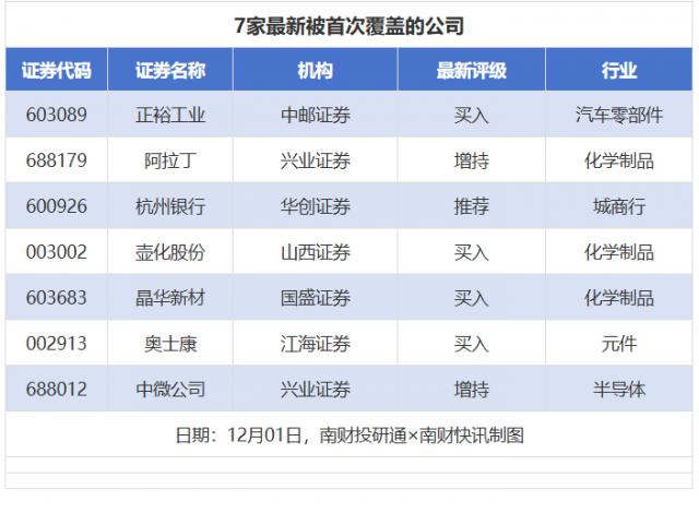 在首次覆盖方面,12月1日券商总共进行了7次首次覆盖操作。正裕工业被中邮证券给予“买入”评级,阿拉丁获得兴业证券的“增持”评级,杭州银行得到华创证券的“推荐”评级,壶化股份获山西证券“买入”评级,晶华新材则被国盛证券给予“买入”评级。