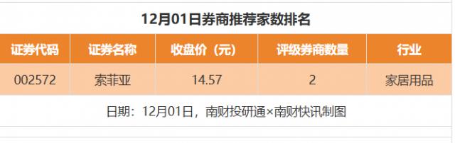 从券商推荐的家数情况来看,12月1日共有27家上市公司得到了券商的推荐。其中,索菲亚获得了2家券商的推荐,博汇纸业、华阳股份等公司则各获得1家券商的推荐。