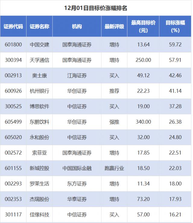 南财投研通的数据表明,12月1日当天,券商针对上市公司给出了15次目标价评估。以最新收盘价为计算基准,目标价涨幅处于前列的公司分别是中国交建、天孚通信和奥士康,它们的目标价涨幅依次达到59.72%、57.91%和42.46%,所属行业分别为基础建设、通信设备以及元件行业。