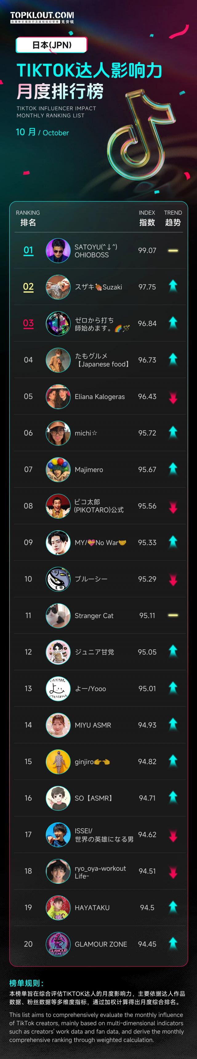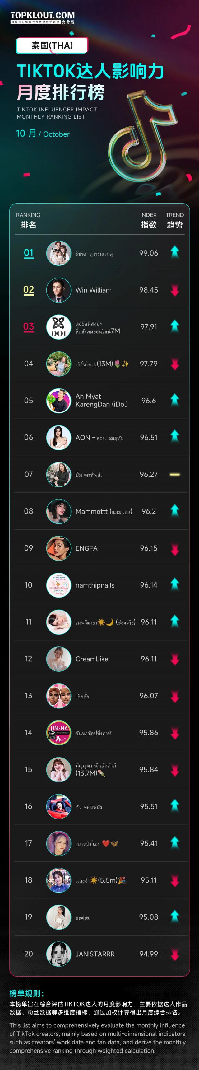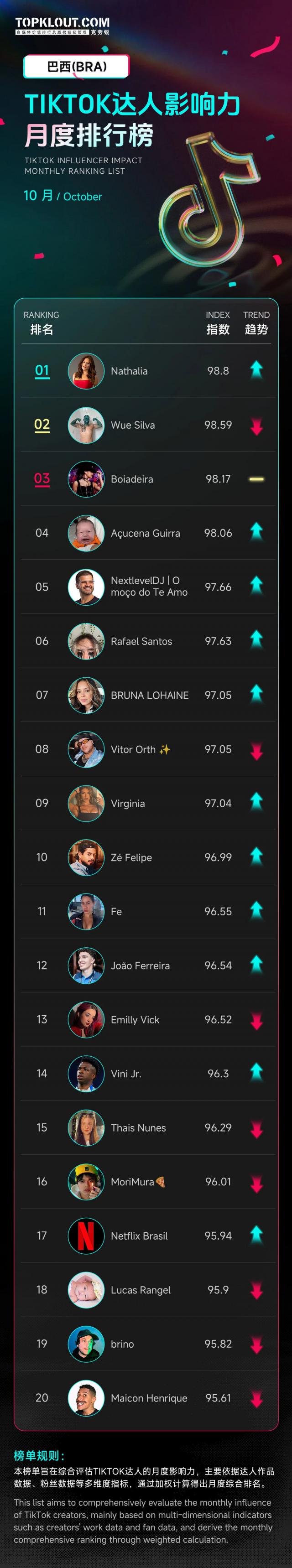 榜单主要依据达人作品数据、粉丝数据等多维度指标,通过加权计算得出月度综合排名,以此评估美国、英国、日本、巴西、泰国、越南等十个国家TikTok达人的月度影响力。