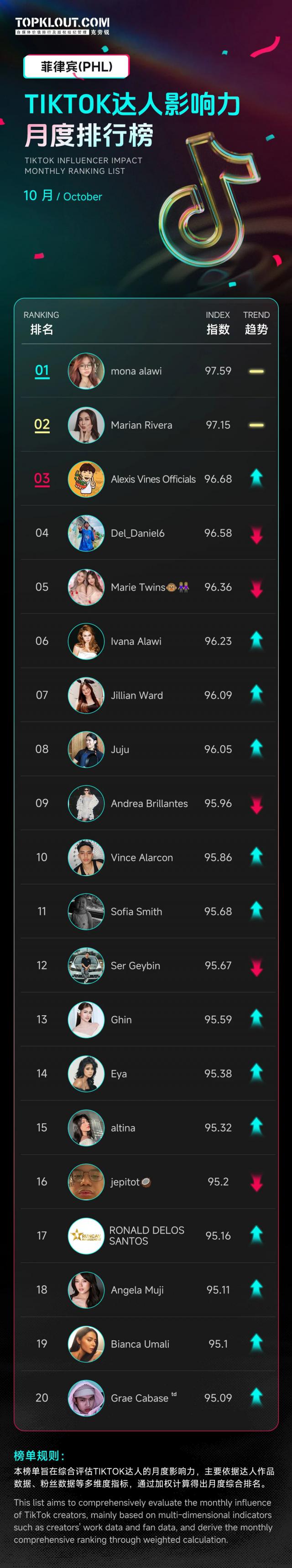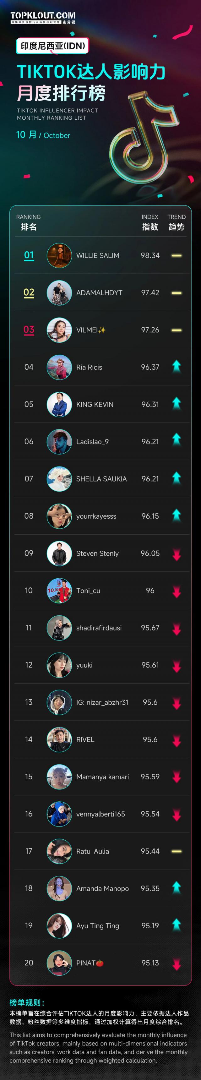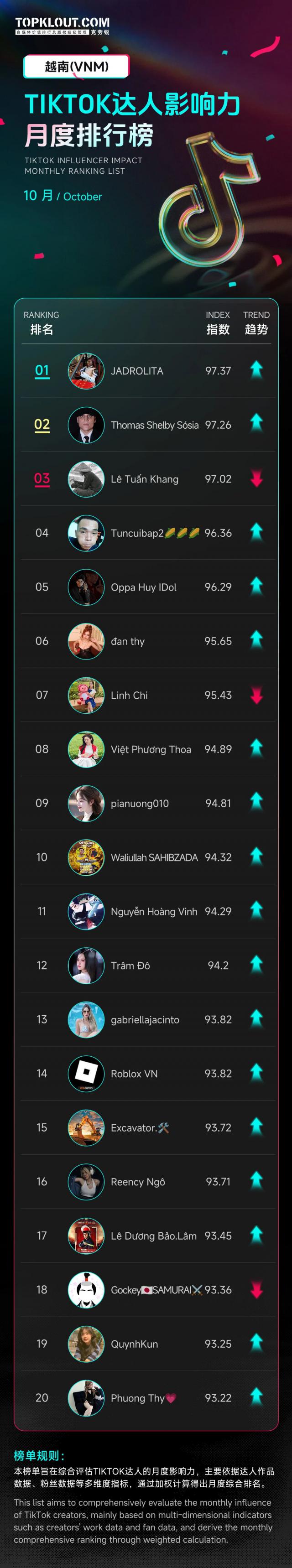榜单主要依据达人作品数据、粉丝数据等多维度指标,通过加权计算得出月度综合排名,以此评估美国、英国、日本、巴西、泰国、越南等十个国家TikTok达人的月度影响力。