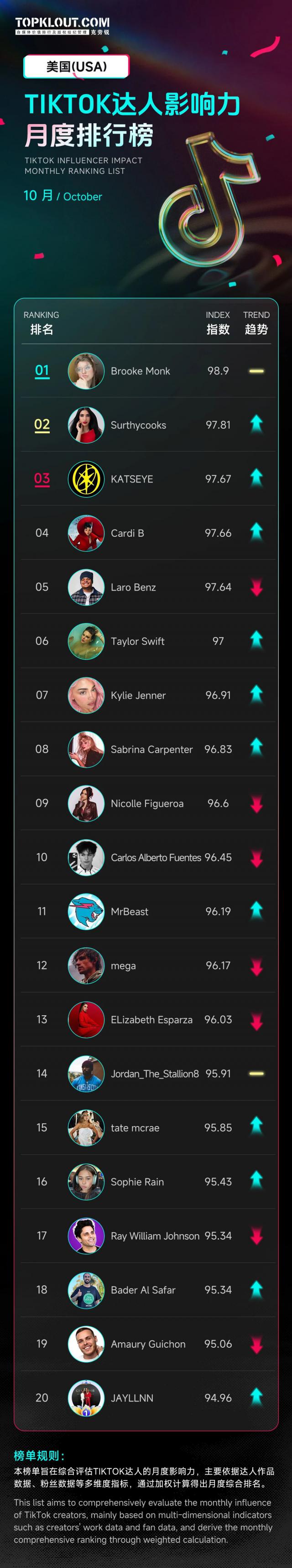 @Brooke Monk三连登顶,十国TikTok达人谁更具影响力?