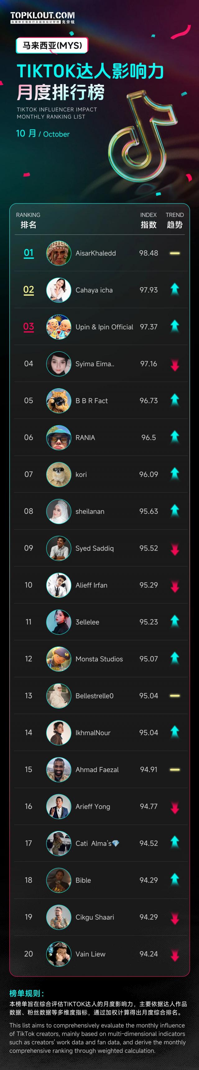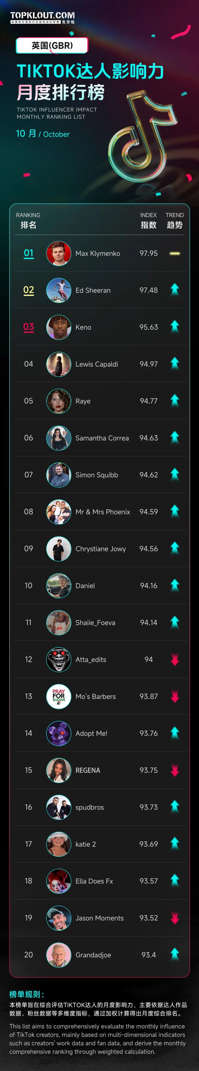 为精准把握TikTok达人生态的动态变化,「克劳锐」全新推出【TikTok达人影响力月度排行榜】,聚焦不同国家的头部达人,呈现各国达人发展状况。该榜单每月发布一期,本期为10月榜单。
