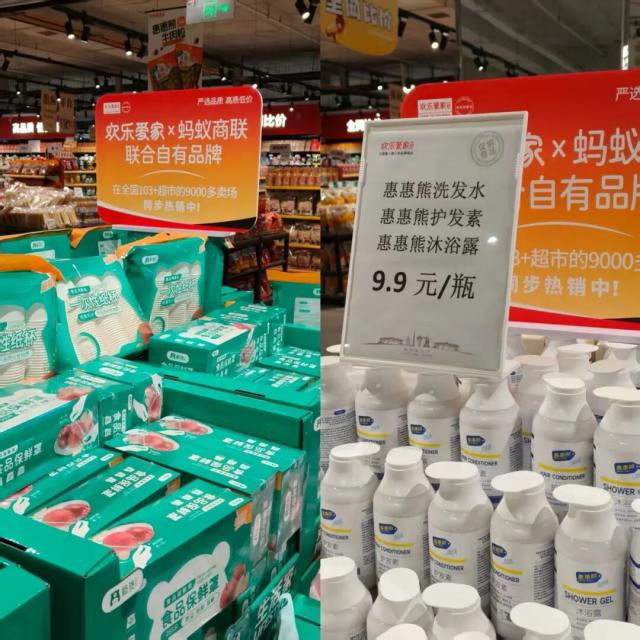 有山姆MM商品提升商品丰富度,欢乐爱家同时与蚂蚁商联合作引进不少自有品牌生活用品,包括"极货"的一次性纸杯、小苏打洗衣皂;"惠惠熊"的洗发水、沐浴露等,持续扩充商品库多样性。
