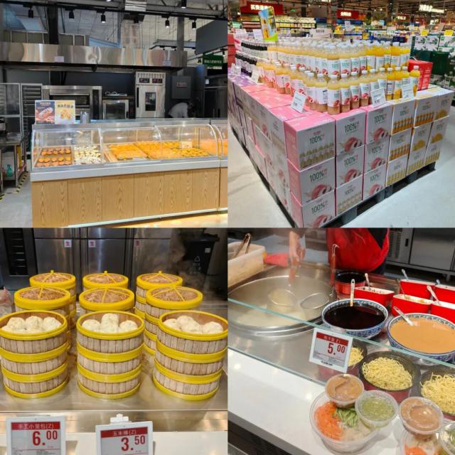 例如,超市入口一侧的自营烘焙区采用"明厨亮灶"模式打造烤制操作间,制作过程全程可视;紧邻烘焙区的是复合果汁、精酿啤酒、白酒等自营商品的大型堆头,强化核心品类曝光;店内深处的熟食鲜食加工区,实时供应热干面、馄饨、米线等现制美食,肉眼可见的新鲜度与烟火气,正是"餐超"模式的核心亮点。