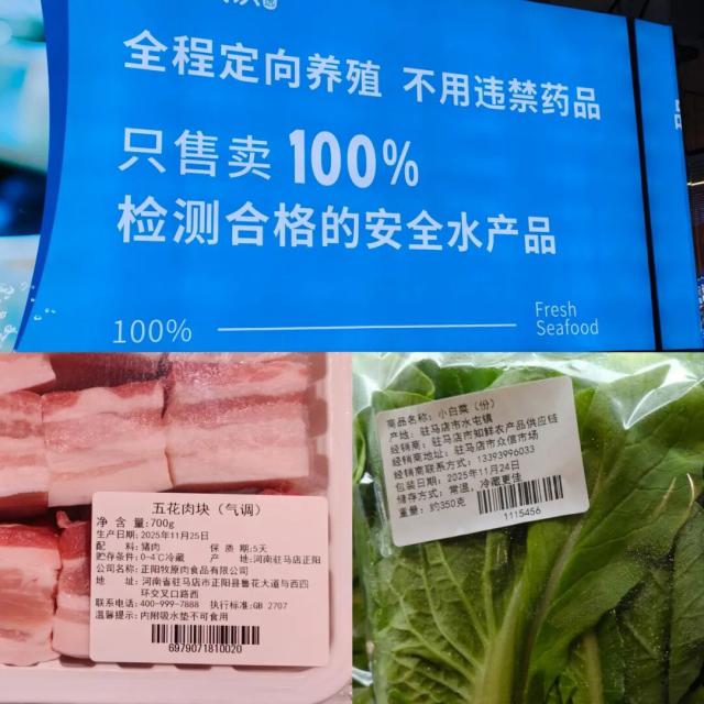 商品定价突出性价比,但这并不意味着欢乐爱家忽视商品品质,这在超市各运营细节中均有体现。比如水产区用醒目招牌标注:全程定向养殖、只售卖100%检测合格的安全水产品;净包装冰鲜猪肉均来自头部企业牧原;叶菜当天从众信市场(本地最大农产品交易中心)直采,确保新鲜溯源。
