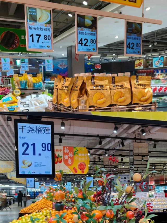 首先,同在驻马店市,欢乐爱家和喜盈门的多款商品价格贴身对标,种类丰富度和性价比优势不分上下。比如,笔者实探当天,两家门店的鲜活虾价格均为27.8元/500g;另外,欢乐爱家所售越南干尧榴莲定价21.9元/500g,而喜盈门有两款榴莲在售,其中越南金枕榴莲售价17.8元/500g、泰国金枕榴莲45.8元/500g。