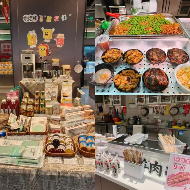 例如,喜盈门在烘焙区旁专门规划配套商品陈列区,摆放花生酱、果酱、咖啡等,方便消费者搭配甜品选购;鲜食加工区品类更为丰富,不仅有避风塘炒虾、现烤羊肉串等热门品类,还纳入扣碗这类河南本地特色美食,更贴合本地口味偏好。