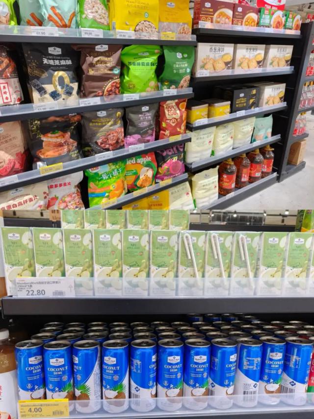 另一个值得注意的细节是,欢乐爱家店内设有专门货架陈列山姆MM商品,这些通过山姆代购商引进的MM自营商品多为零食饮料品类,包括地瓜棒、板栗仁、花生仁、椰子饮料等。