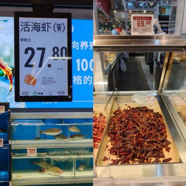 「零售商业财经」实地探访发现,普通便利店售价3元的500ml绿茶,欢乐爱家店内仅售2.1元;当日鲜活海虾定价27.8元/500g;胖东来等商超售价80-90元/500g的麻辣牛肉条,欢乐爱家当日现做款仅售69.8元/500g,价格优势显著。