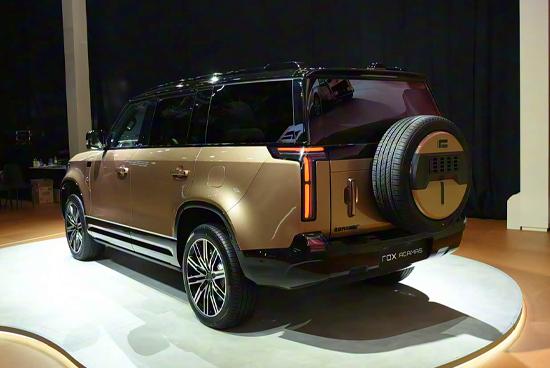 车身侧面依旧维持硬朗挺拔的轮廓,平直的车身表面搭配宽大的轮眉设计,强化了整车的越野气质。车身尺寸方面,其长宽高分别为5050(5298)mm×1985mm×1869(1856)mm,轴距为3010mm。车尾部分同样延续方正硬派的布局,尾灯采用纵向设计并做了黑化处理,与整车风格更为协调。