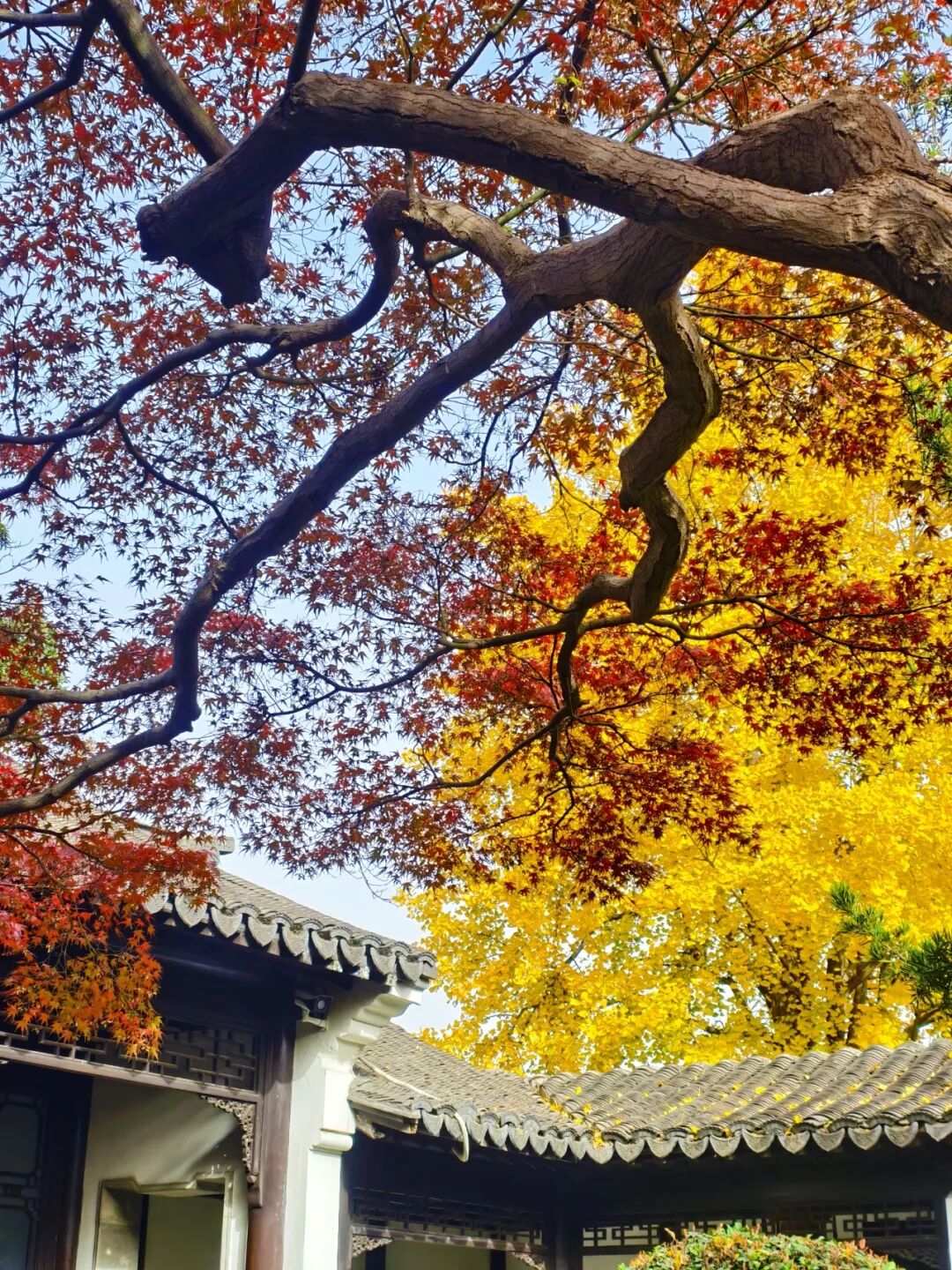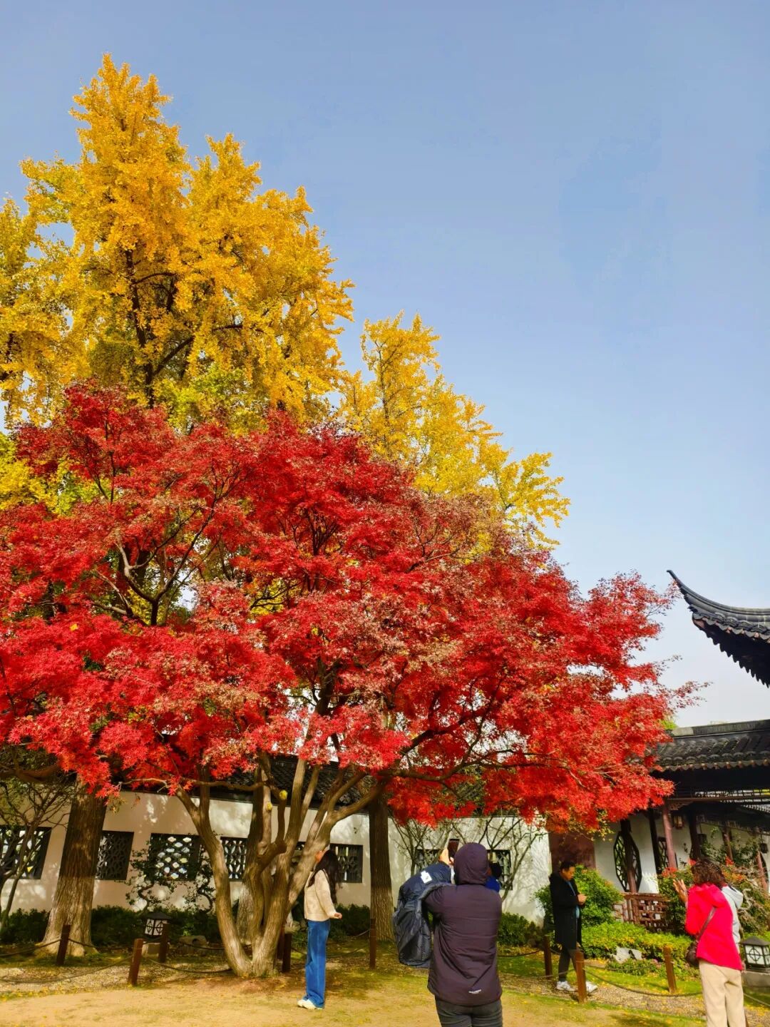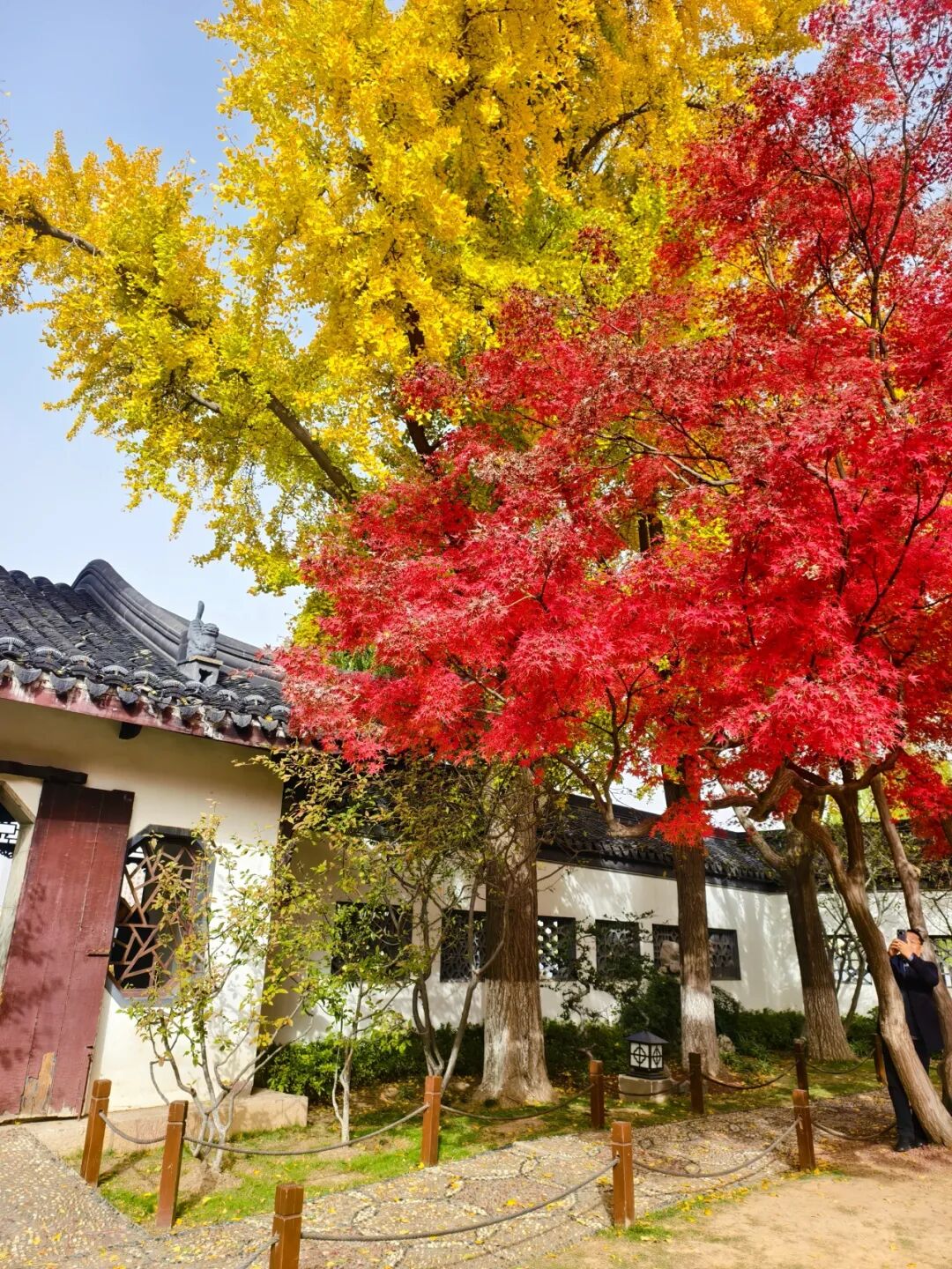 近期,莫愁水院的红枫与银杏组合格外引人注目。两树相邻,一红一黄的搭配十分吸睛。