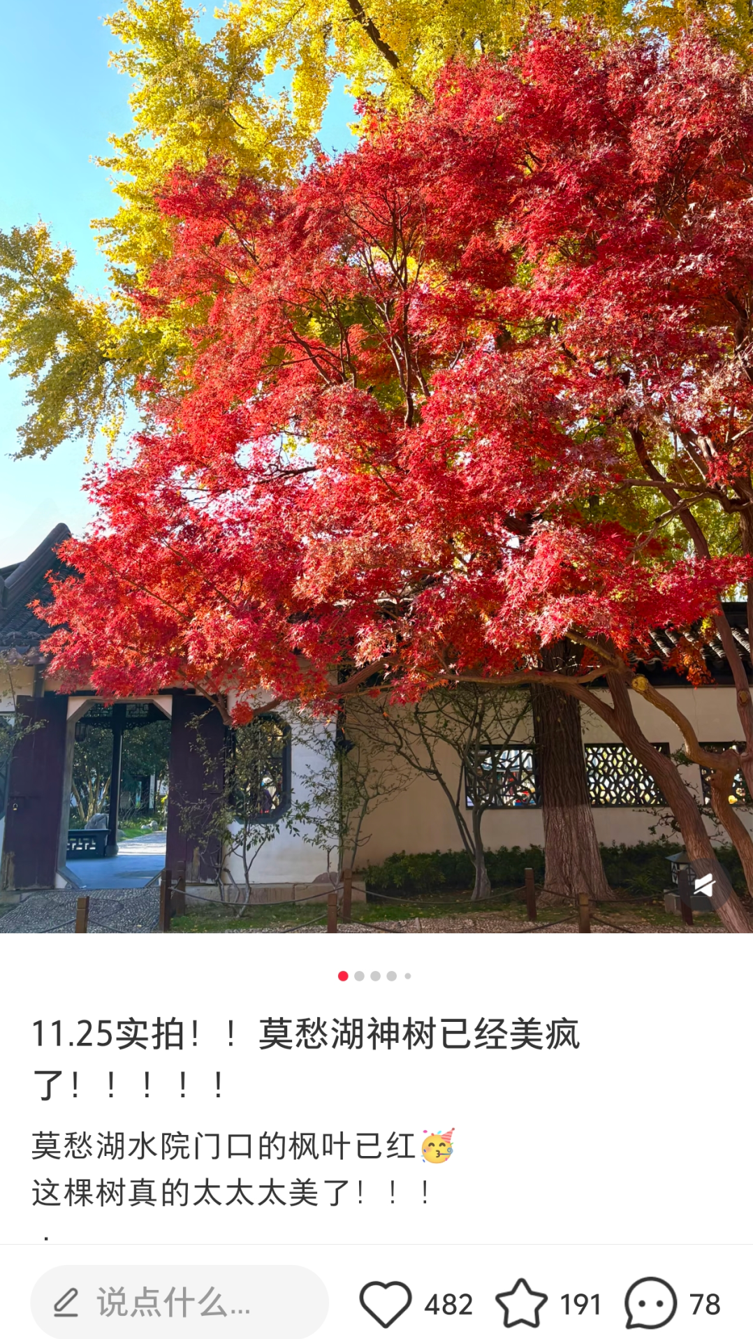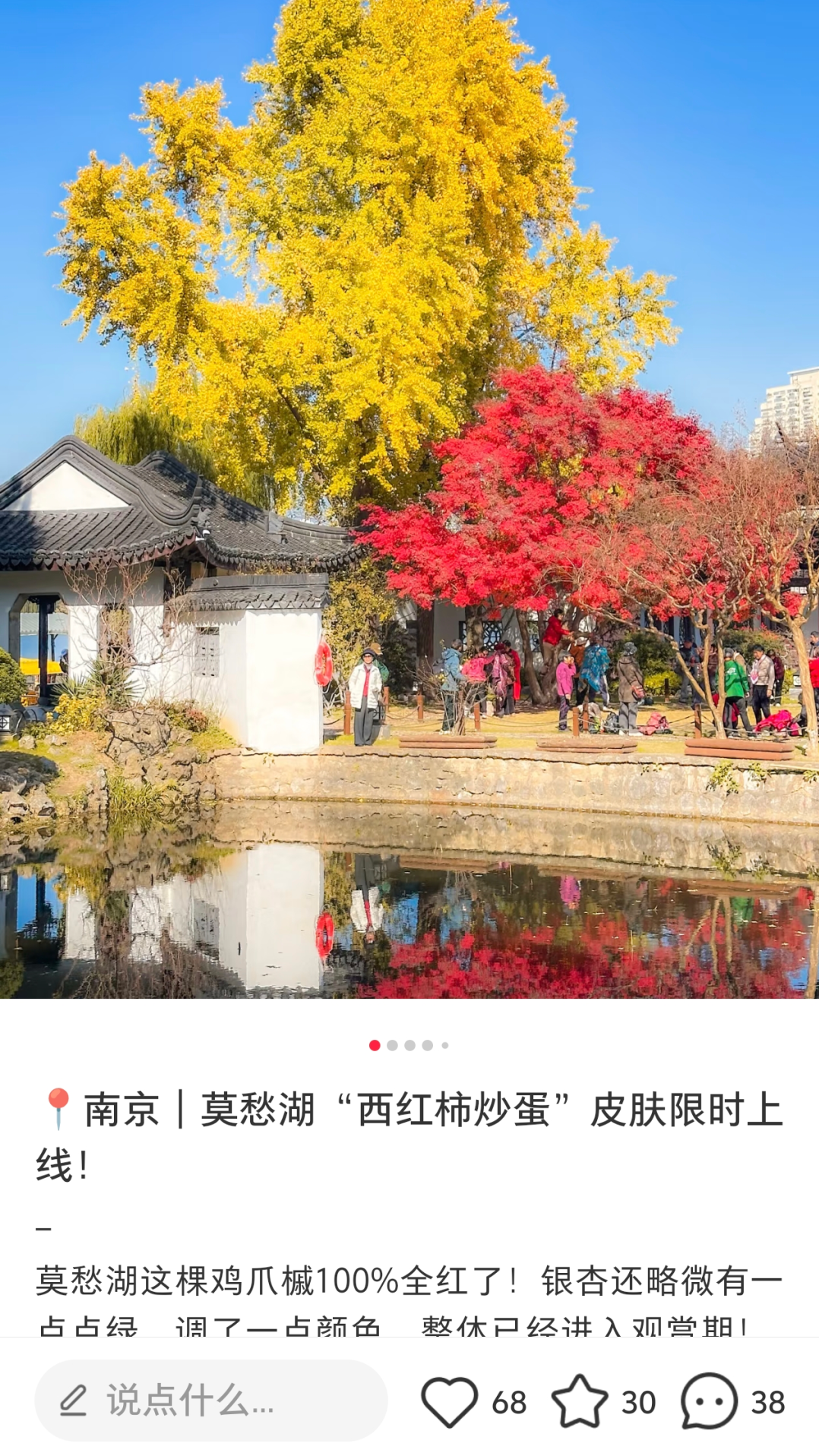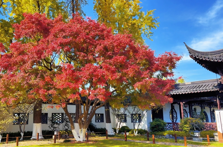 近期,莫愁水院的红枫与银杏组合格外引人注目。两树相邻,一红一黄的搭配十分吸睛。