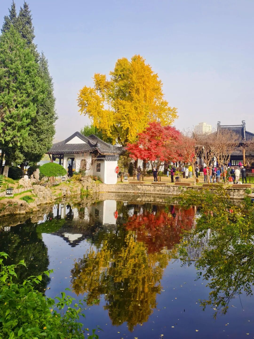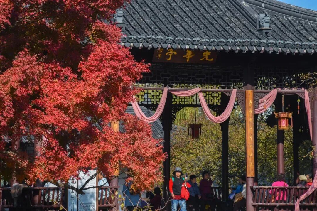 深红的枫叶与金黄的银杏交织在一起,每一步都有不同的景致。此时的莫愁湖,不仅是中式美学的体现,更是天然的拍照好去处,每一处都让人沉醉。