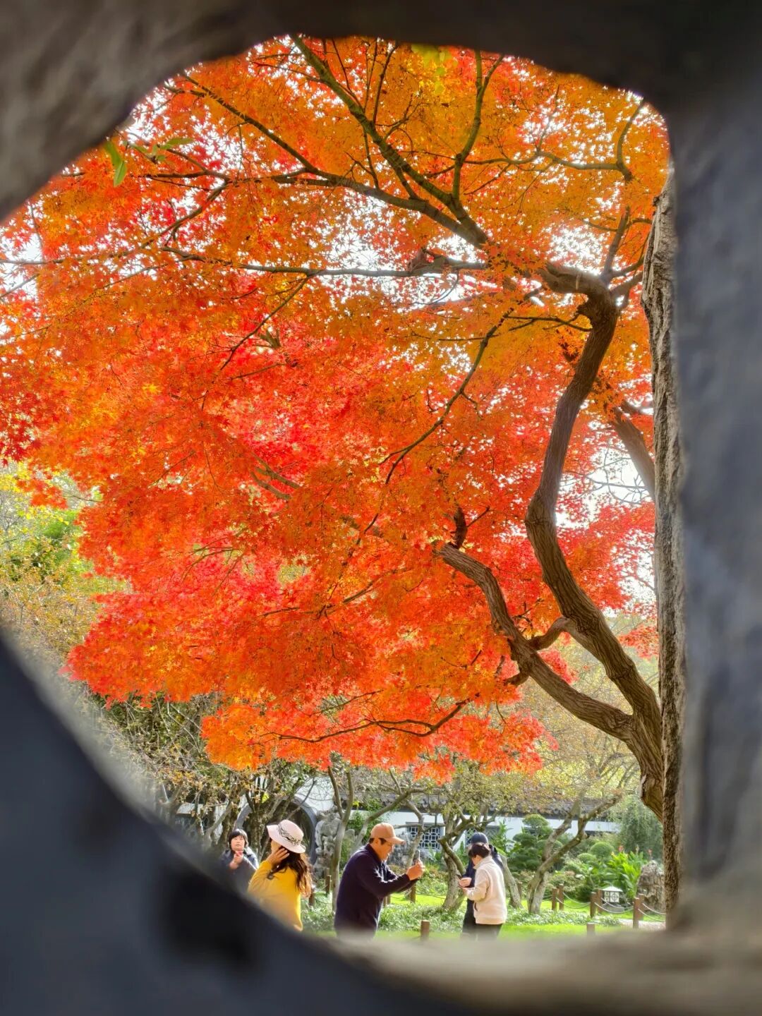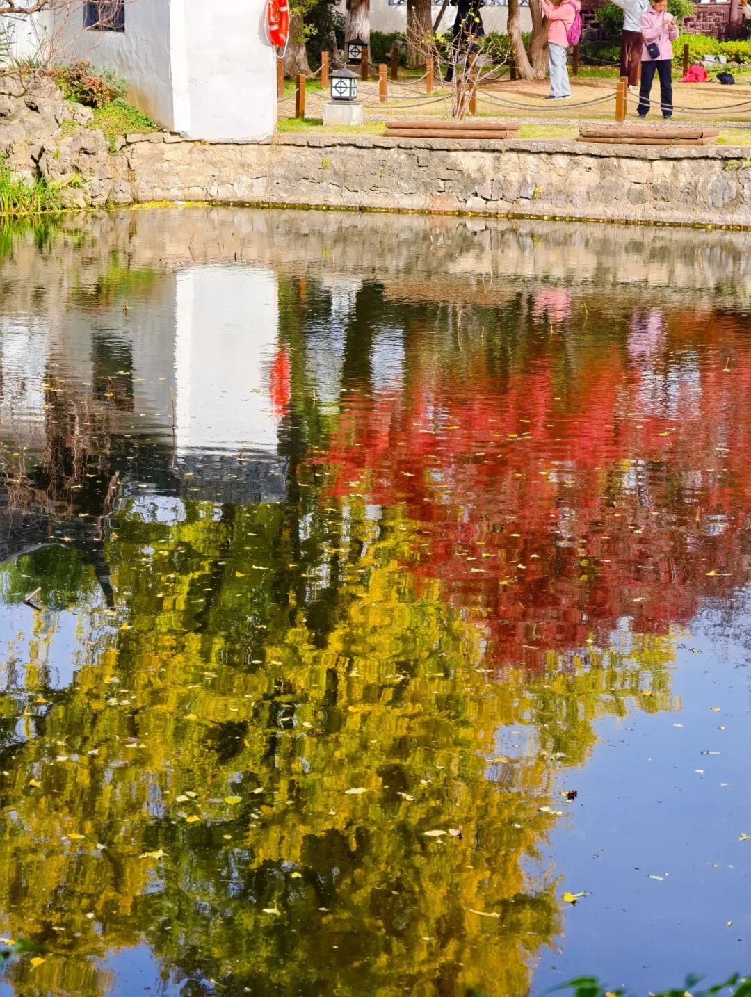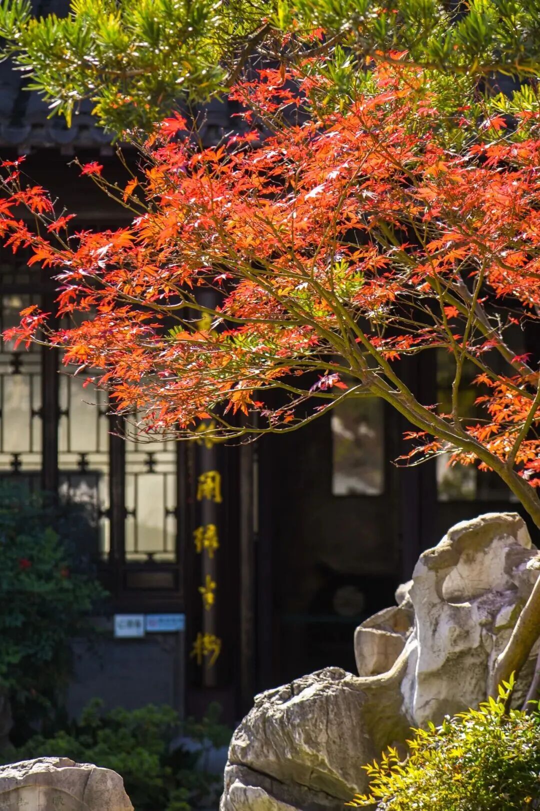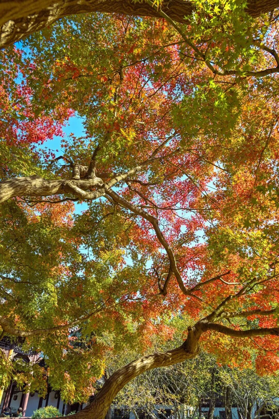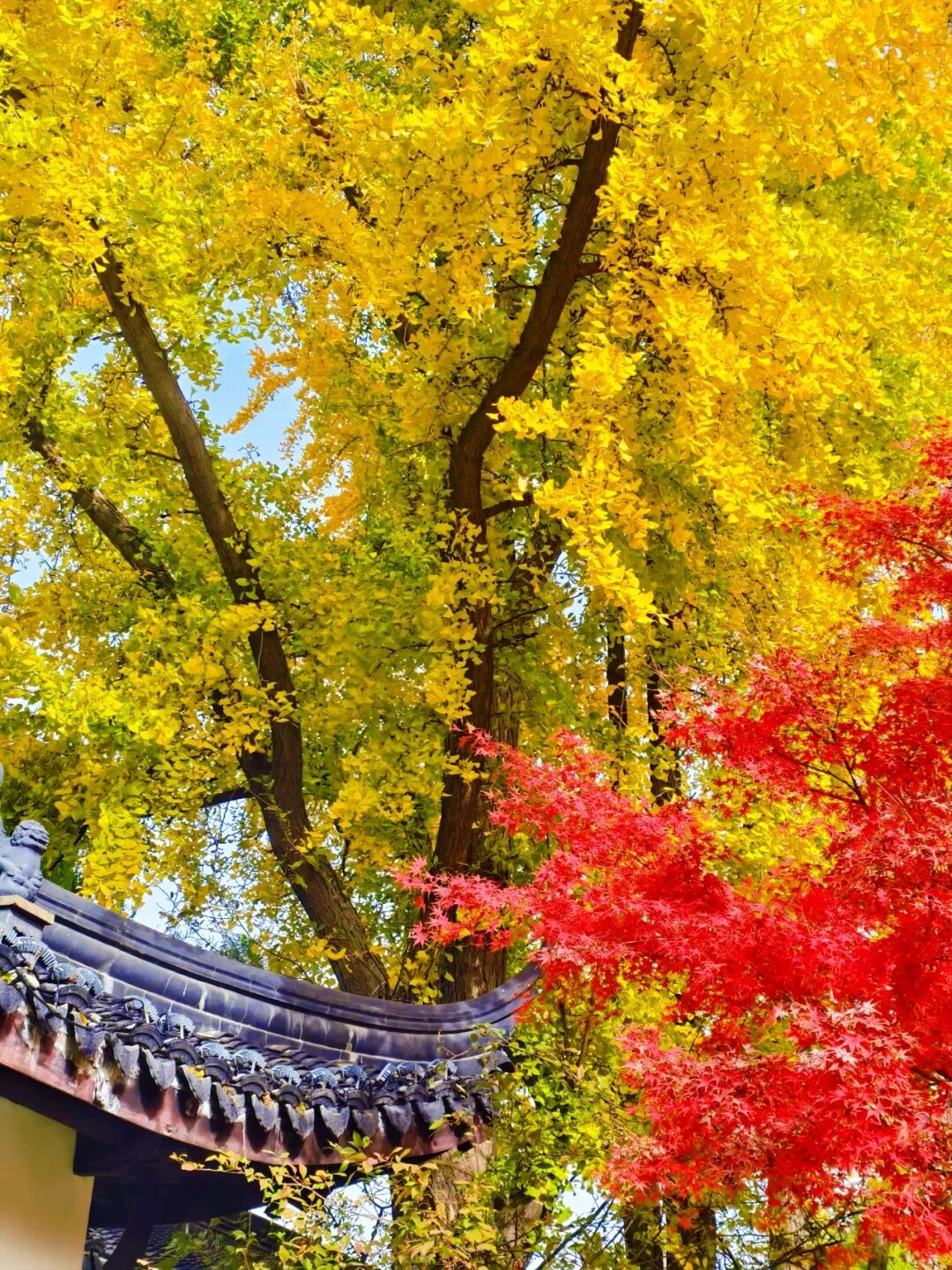 银杏与红枫的组合已将浪漫拉满,再配上园内的古风建筑,景致更为动人。