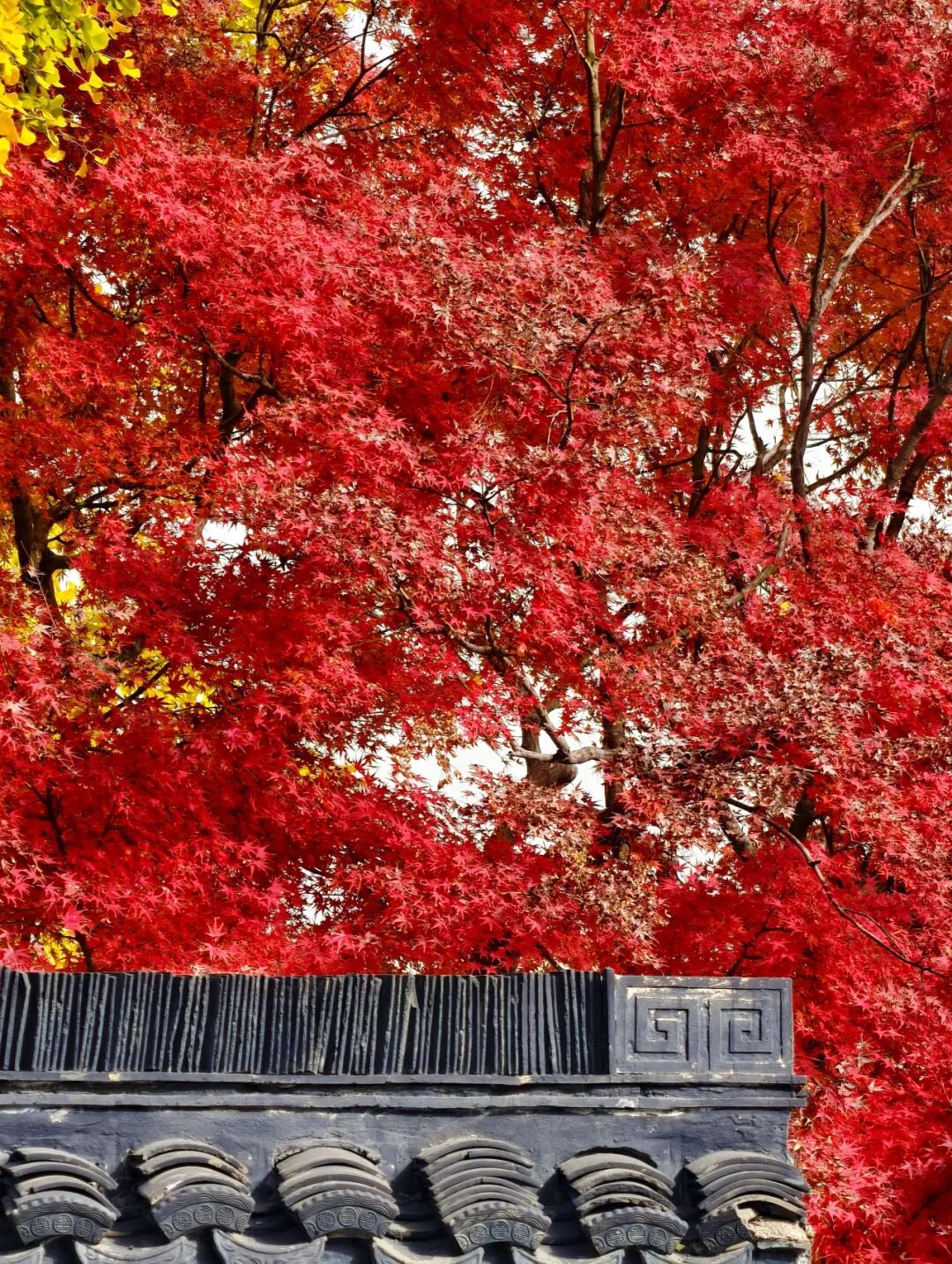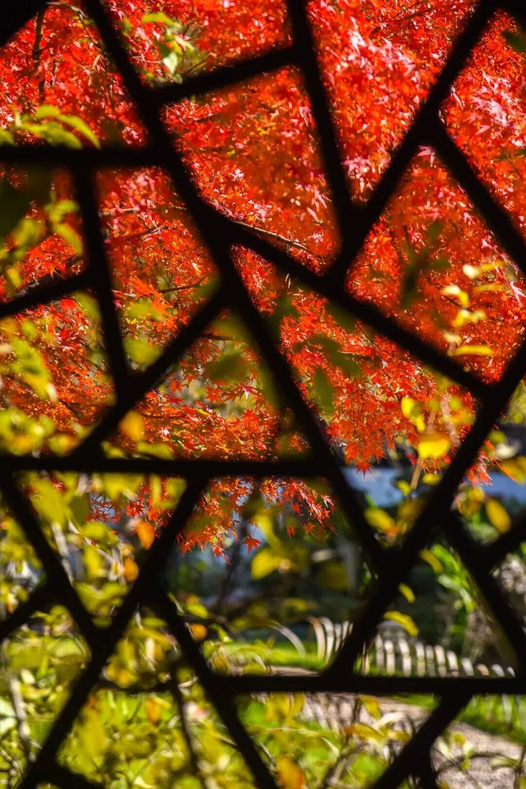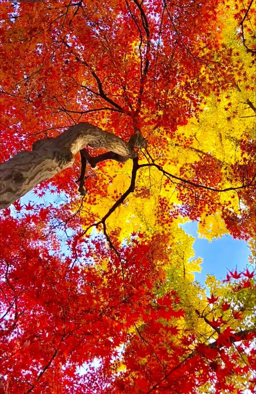 旁边的红枫则像燃烧的火焰,掌状的叶片红得浓烈,既似燎原的烈火,又若倾泻的晚霞。