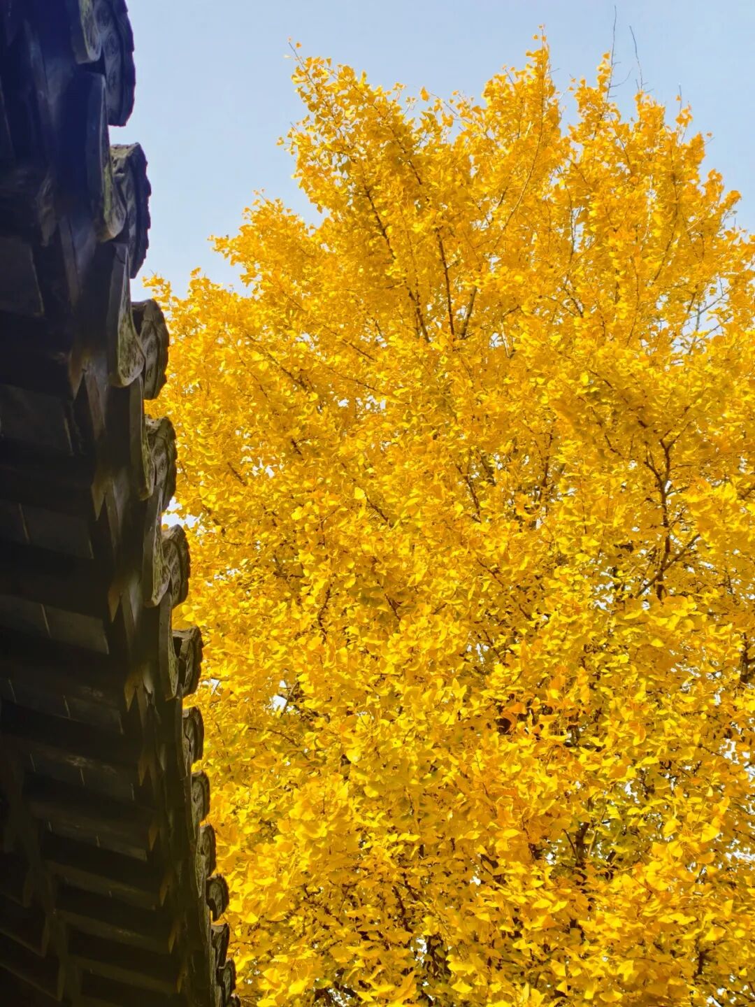 银杏叶已被秋意染成金黄,扇形的叶片薄而透亮,在阳光下闪烁着柔和的光芒,仿佛枝头挂满了金箔。