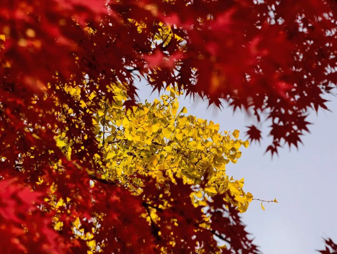 红色与黄色相互衬托,金黄的澄澈中和了枫叶的炽热,嫣红的浓烈又点亮了银杏的温润。