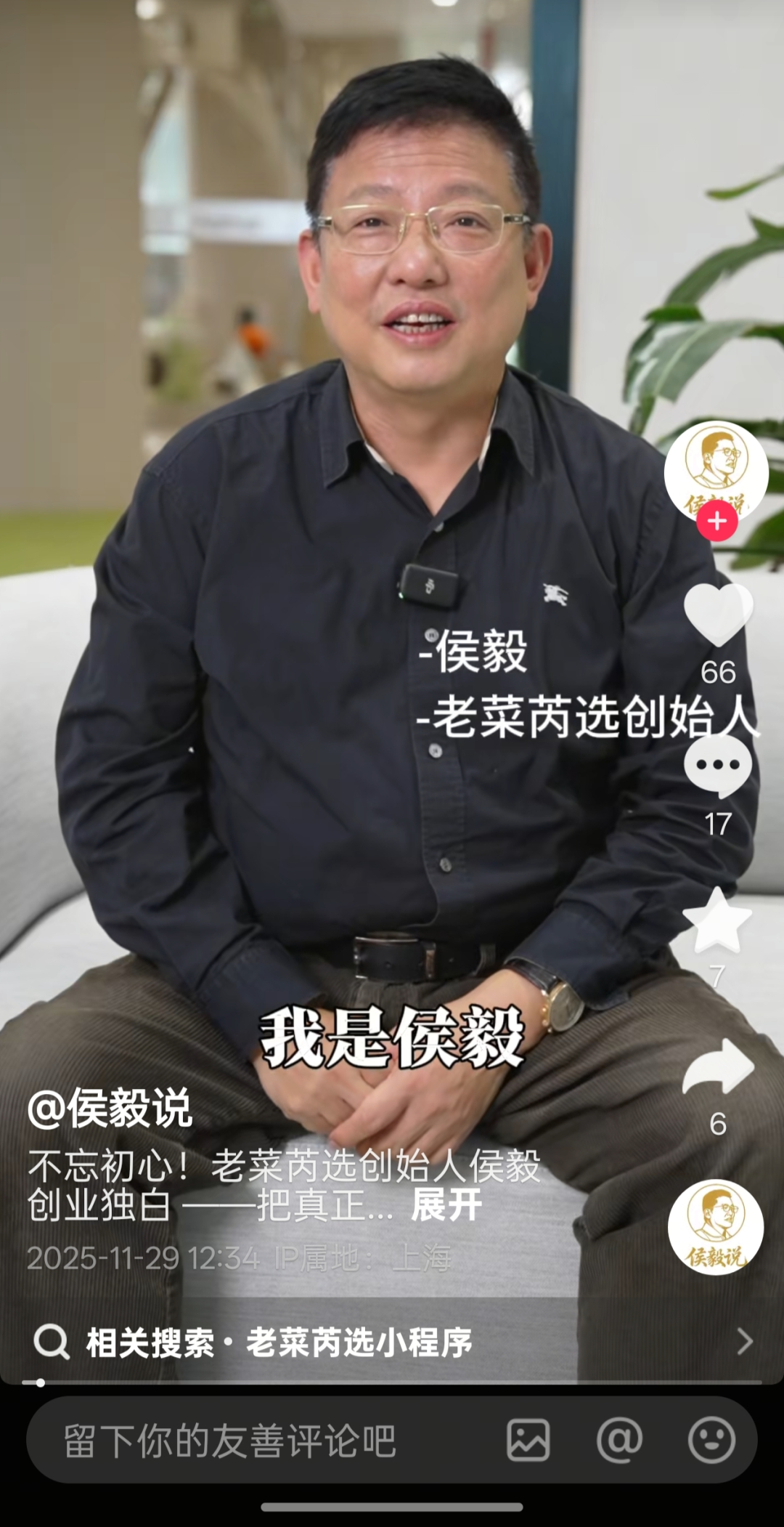 侯毅在视频中解释,自己热爱美食且常下厨,退休后想将兴趣与创业结合,通过“老菜芮选”的直播、小程序和私域,把优质食材推荐给消费者。值得注意的是,这并非他首次创业——2024年2月他曾进军宠物食品零售,创立派特鲜生品牌。