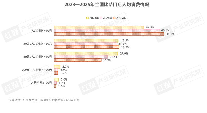 红餐大数据显示,截至2025年10月,人均消费在30元以下的比萨门店占比高达48.1%,位居第一;30-50元区间的门店数占比为28.5%,排在第二位;50-80元区间的门店数占比也超过了20%;80元及以上的比萨门店占比则较少。