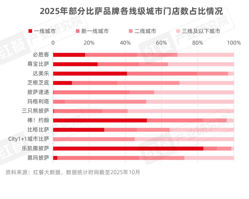 以达美乐为例,2025年新入驻城市同样以二线和三线为主。数据显示,截至10月,其一线城市门店占比从2024年初的60%降至40%。