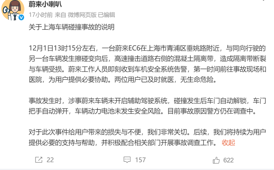 12月1日,蔚来官方账号@蔚来小喇叭 针对该起上海车辆碰撞事故发布情况说明: