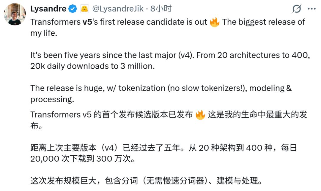 这次更新标志着这一全球最流行的 AI 基础设施库,正式跨越了从 v4 到 v5 长达五年的技术周期。