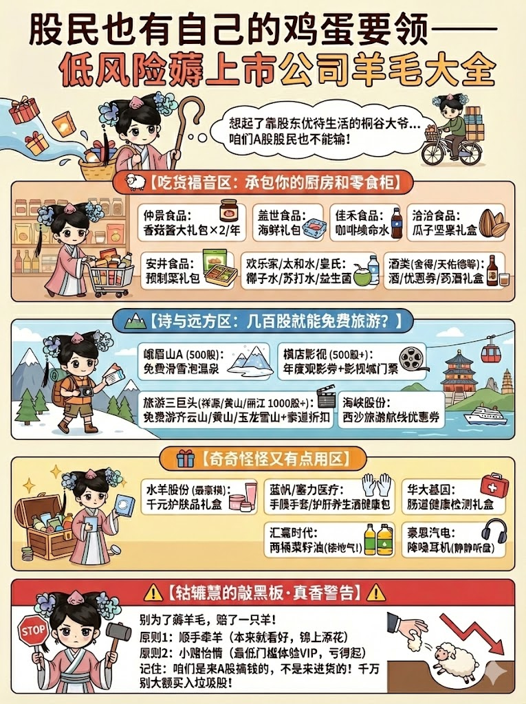 轱辘慧连夜整理出《A股低风险股东福利指南(近期版)》,虽暂无法像桐谷大爷般实现“全福利生活”,但操作得当,零食柜、化妆台补给乃至旅游计划都能被上市公司“承包”!