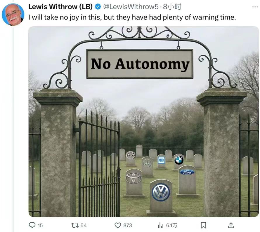 另一位网友回复了一张图片,配文“我并不高兴,但他们已有足够警告时间”。图片中多家车企巨头被“埋葬”在“无自主权”墓园,暗讽其“没救了”。
