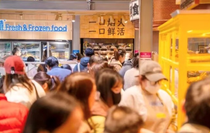 据悉,这家旗舰店共上架超1500个SKU,其中自有品牌占比超90%,新品占比超70%。不同于传统商超的货架模式,三只松鼠通过中央厨房直配与门店现制结合,打造涵盖现制烘焙、熟食、水饮、果蔬生鲜、日化百货及休闲零食的全品类矩阵,聚焦家庭高频高质消费需求。