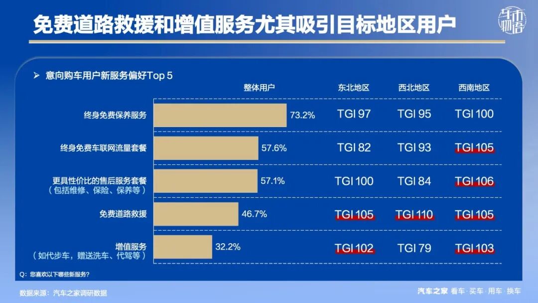 西南用户对新服务接受度更高,除免费保养外,对其他四项更关注;东北用户更在意免费救援和增值服务;西北用户仅对免费救援兴趣较高,TGI达110,高于其他地区。