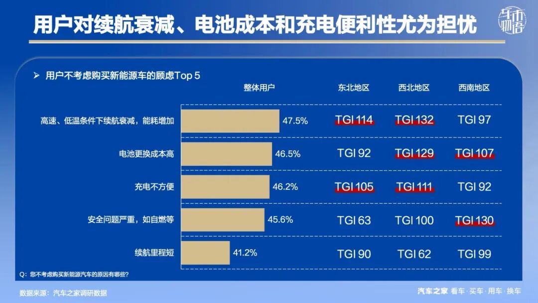在用户不考虑新能源车的五大顾虑中,三地区用户对前四项的担忧更强烈。东北和西北因气温低,对高速、低温下续航衰减和能耗增加的顾虑更深,TGI分别为114和132;充电不便也是两地用户的难题,TGI为105和111。品牌增设充电站或强化续航衰减承诺,有助于提升用户信心。