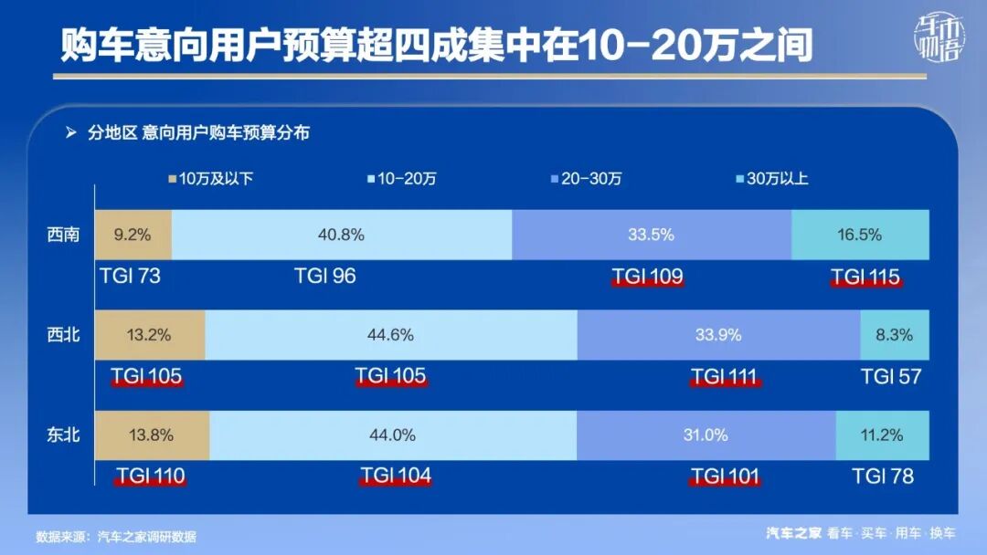 细分预算分布:西南高预算用户占比相对更高,30万以上区间TGI达115;西北和东北则以20万以下预算为主,其中东北10万及以下预算TGI为110,在三地区中最高。
