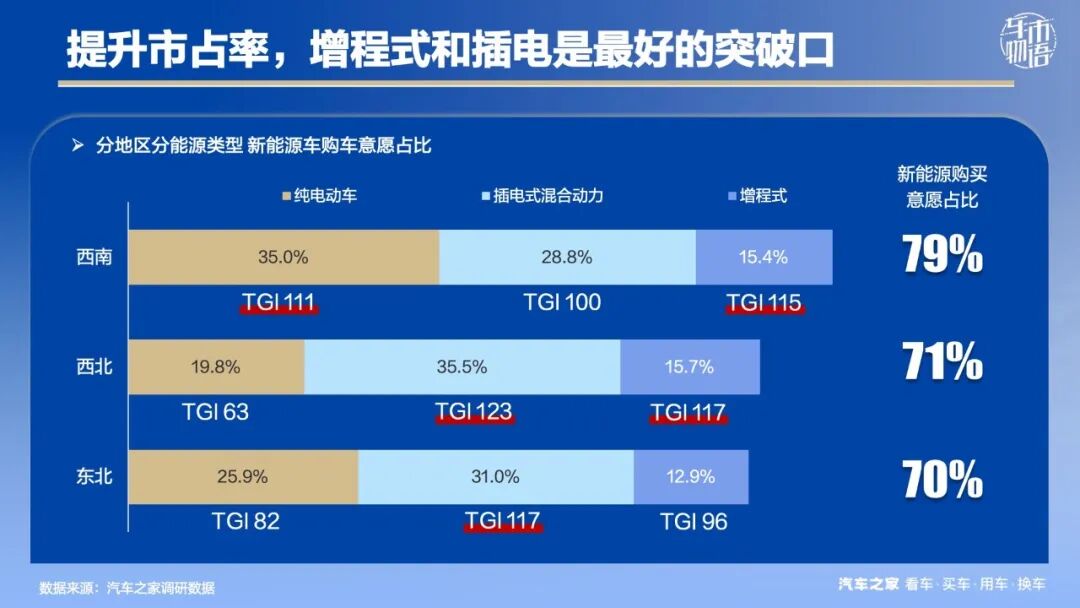 细分能源类型偏好:西南用户对纯电动和增程式的偏好高于整体市场,TGI分别为111和115;西北用户更青睐插电式混合动力和增程式,TGI达123和117;东北因气温更低,对插电式混合动力信心更足,TGI为117。