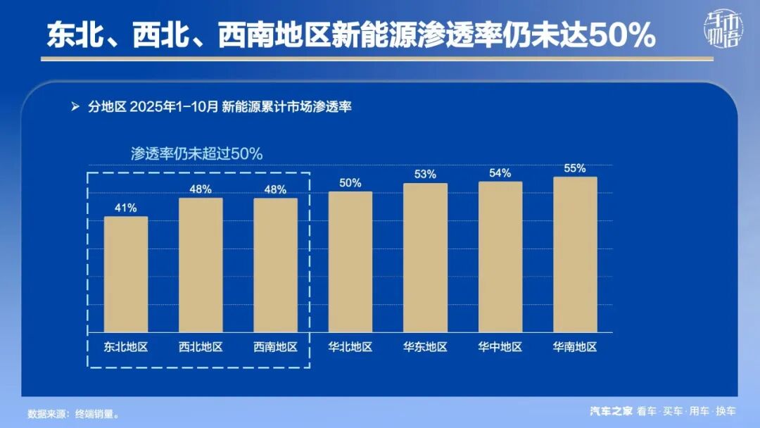 分区域来看,并非所有细分市场都实现了50%的渗透率跨越。东北、西北和西南地区仍以燃油车为主,2025年1-10月新能源渗透率均未超50%,其中东北地区最低,仅为41%。