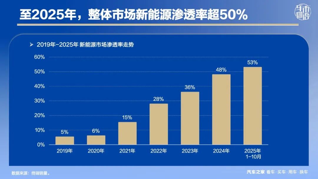 2025年1-10月,新能源市场渗透率首次突破50%,但增速有所放缓,同比2024年同期仅增长6个百分点。