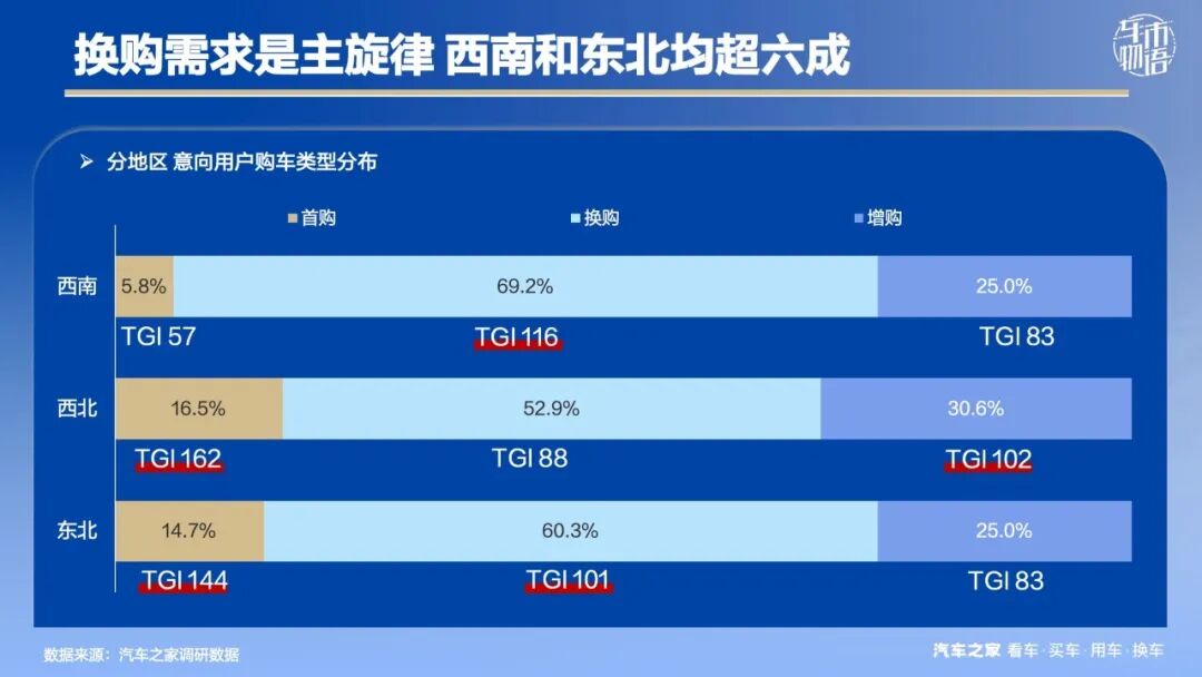 从购车类型看,换购是主流需求,西南换购占比最高达69.2%,西北也超半数。